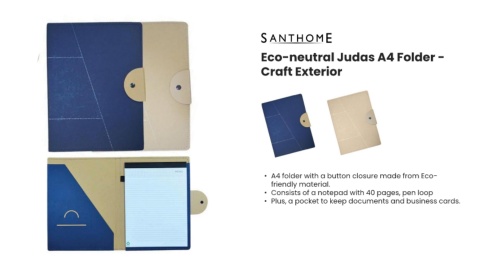 Eco-neutral Judas A4 Folder - Craft Exterior • A4 folder with a button closure made from Eco- friendly material. • Consists of a notepad with 40 pages, pen loop • Plus, a pocket to keep documents and business cards.