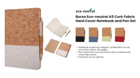 Borsa Eco-neutral A5 Cork Fabric Hard Cover Notebook and Pen Set • Notebook made from elegant combination of cork and cotton fabric. 160 pages • Pen made from cork and wheat straw material with matching colours • Packed in an eco gift box
