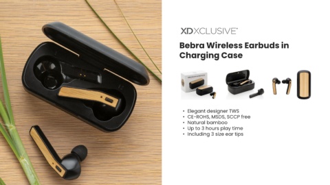 Bebra Wireless Earbuds in Charging Case • Elegant designer TWS • CE-ROHS, MSDS, SCCP free • Natural bamboo • Up to 3 hours play time • Including 3 size ear tips