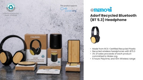 Adorf Recycled Bluetooth (BT 5.3) Headphone • Made from RCS-Certified Recycled Plastic • Recycled wireless headphones with BT5.3 • 3% of sales proceeds of each product committed to Water.org • 6 hours Playtime, and 10m Wireless range